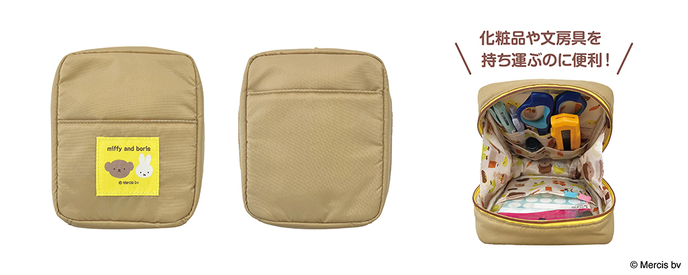 化粧品や文房具を入れるなどマルチに使用できるポーチ。内側にポケットが4つ、ブラシやペンを立てられる仕切りが2つ付いていて便利にご使用いただけます。※ご使用のブラシやペンのサイズによっては立てられない場合がございます。